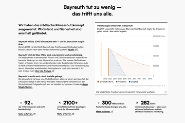 Dass Bayreuth derzeit auf keinem guten Weg ist, zeigt die Analyse der verfügbaren Informationen. Zwar ist das erklärte Ziel gemäß Beschluss des Stadtrates bis 2040 klimaneutral zu sein, aber es wird zu wenig dafür getan. Zudem gibt es keinen Plan mit messbaren zeitlichen und quantifizierten Meilensteinen.